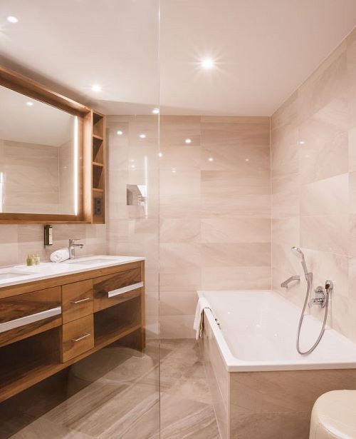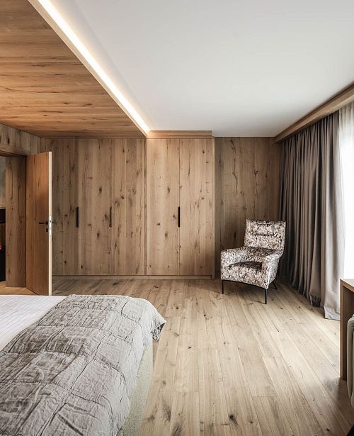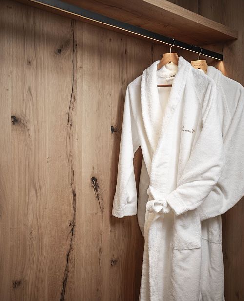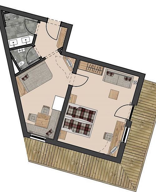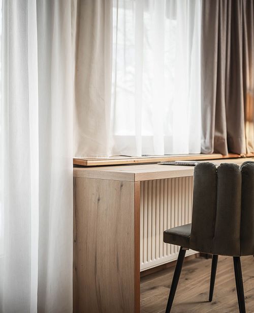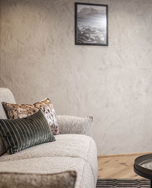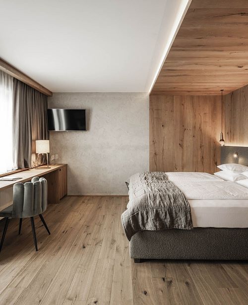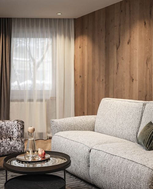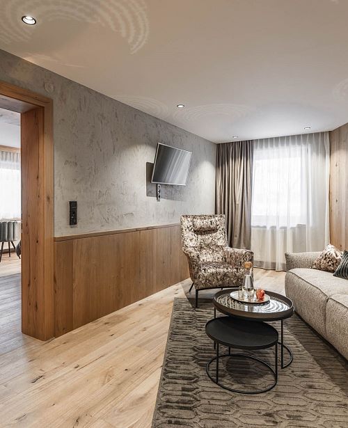 Familienzimmer im Chalet Theresia mit exklusiver Ausstattung, Holzböden, Wohn- und Schlafzimmer getrennt, Wohnraum mit Effektfeuerkamin, Komfortbadezimmer mit Dusche und Badewanne, getrenntes WC, Balkon oder Terrasse. Für die Kinder befindet sich eine Ausziehcouch im abtrennbaren Wohnbereich.