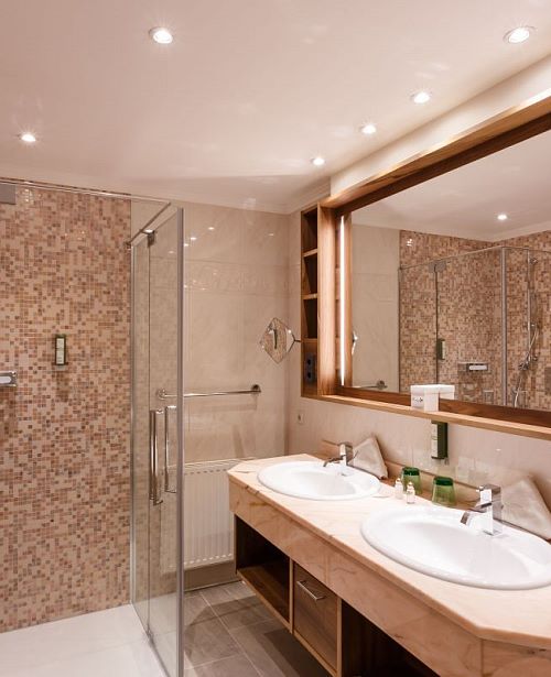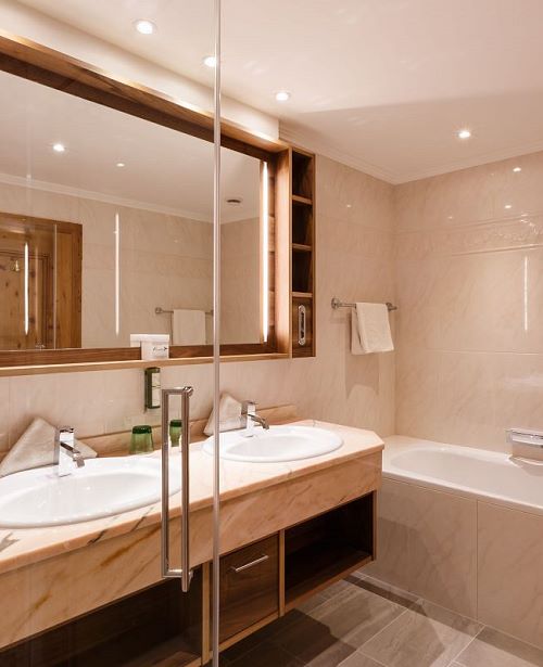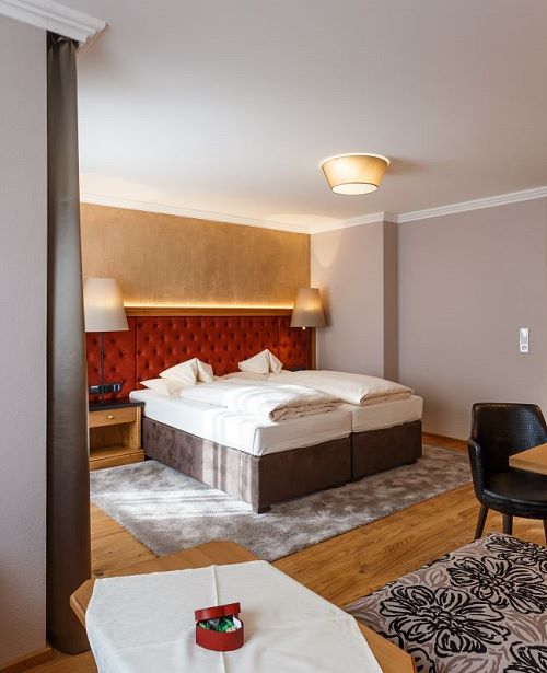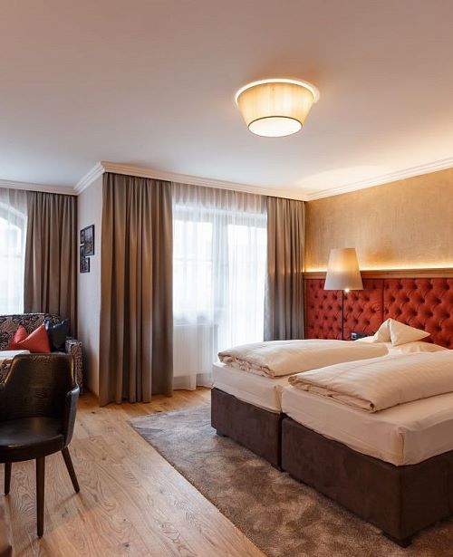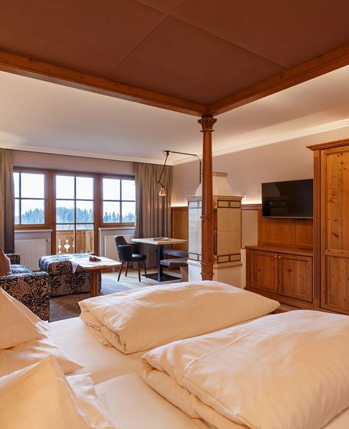 Double room in Chalet Elisabeth - connecting corridor to the hotel complex, spacious rooms, wooden floors, living area with tiled stove, spacious bathroom with double washbasin, bathtub and shower, separate WC, balcony or terrace. There is a pull-out couch in the living area for a third person.
