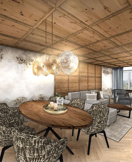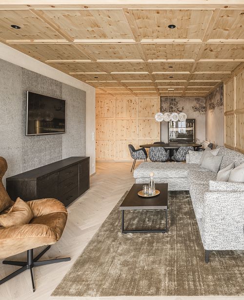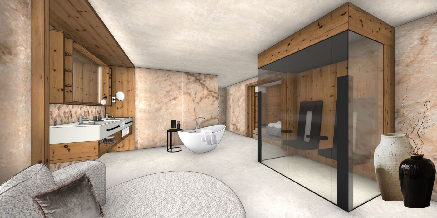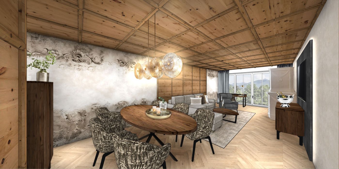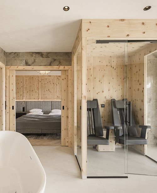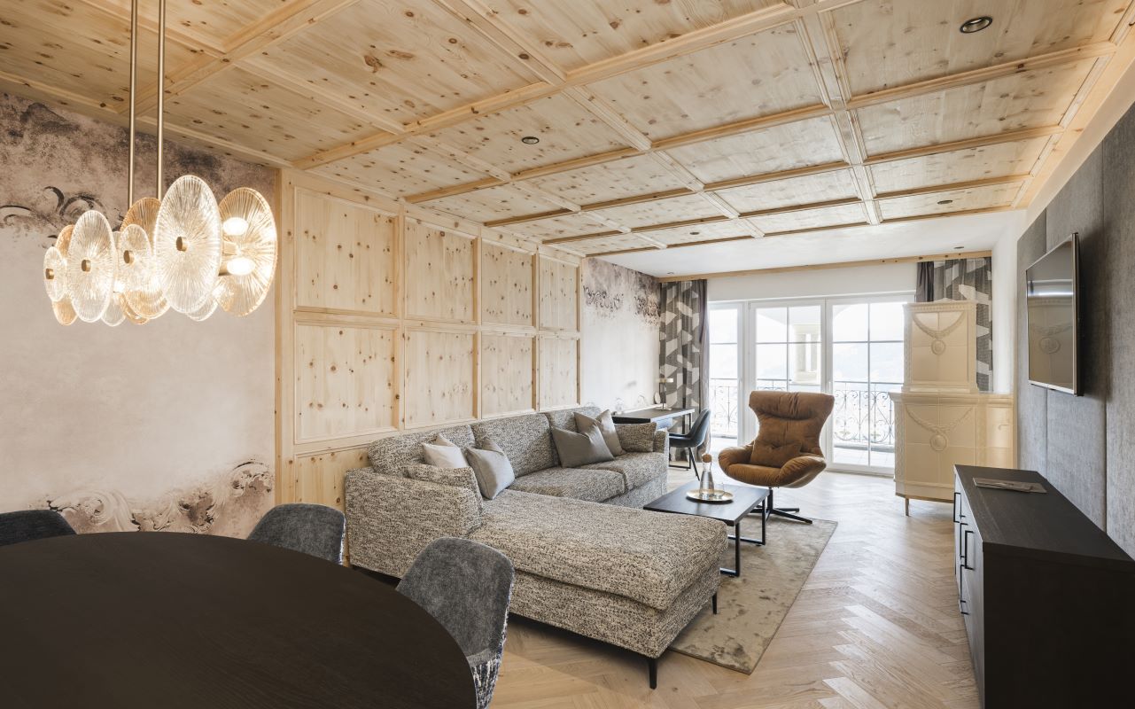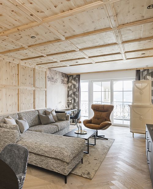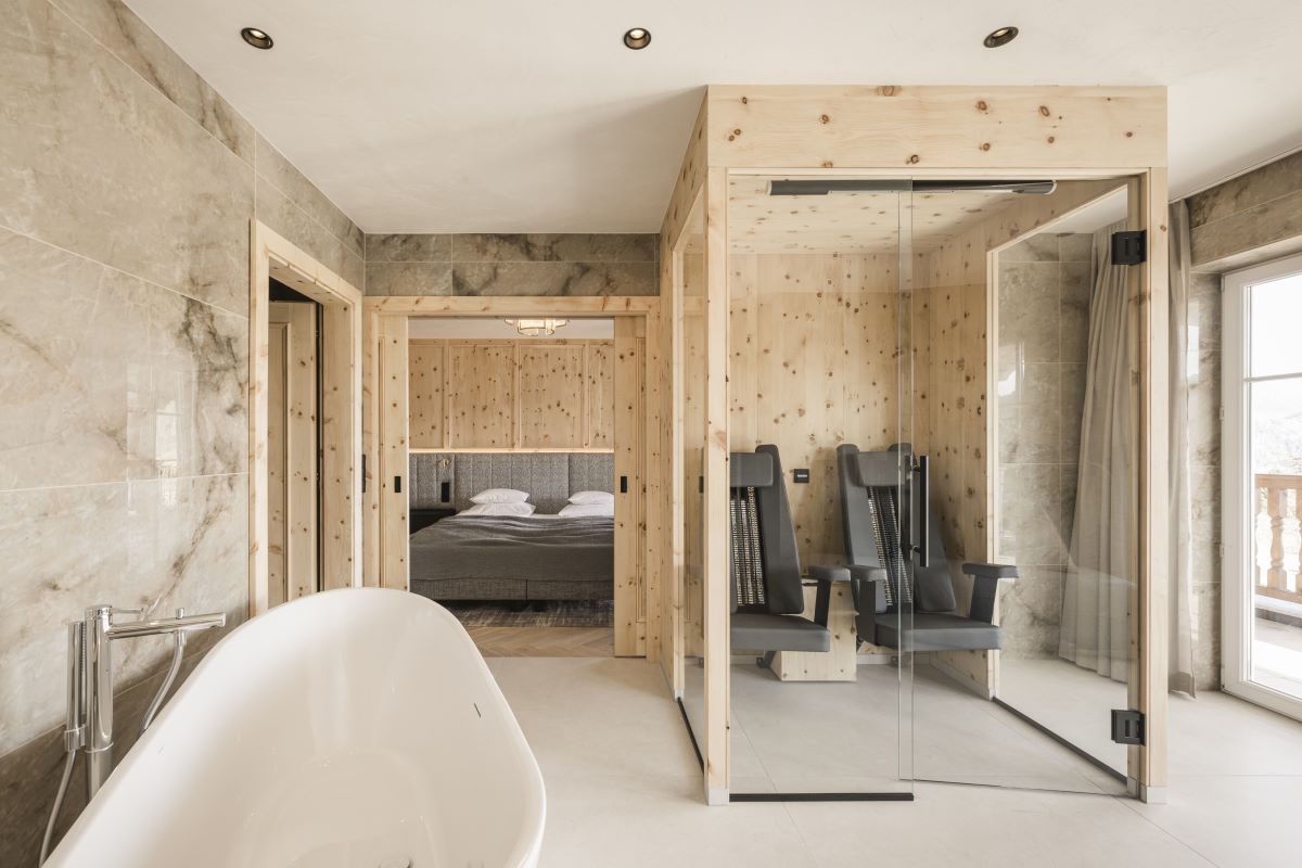 Suite in the Romantikschlössl with Swiss stone pine furnishings - Exclusive living room with large table, sofa, and tiled stove, 2 separate bedrooms, walk-in closet area, 2 spacious bathrooms with shower and bathtub, sauna, infrared cabin, relaxation lounger, separate toilet with bidet, balcony.