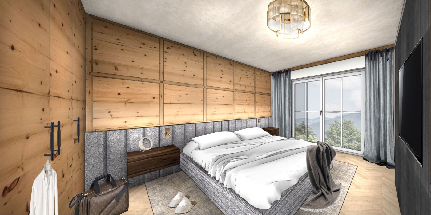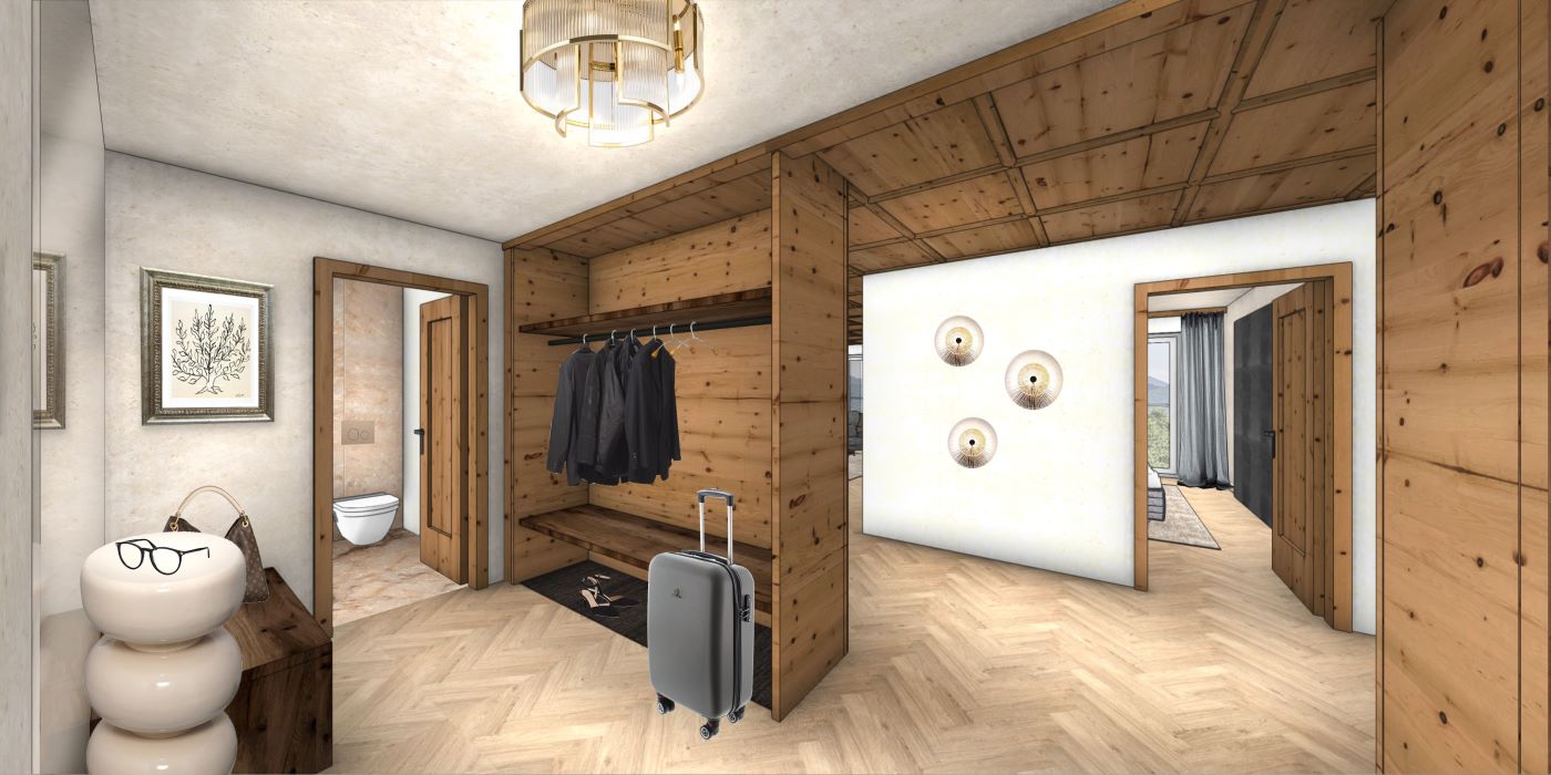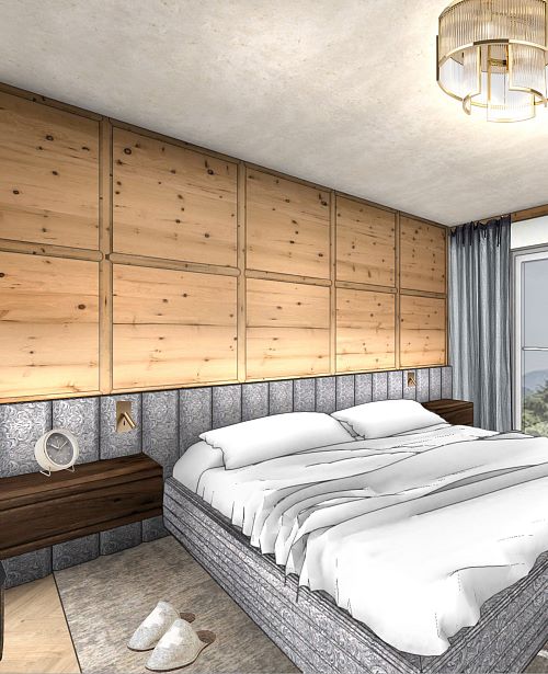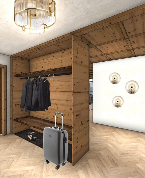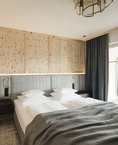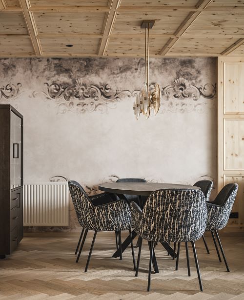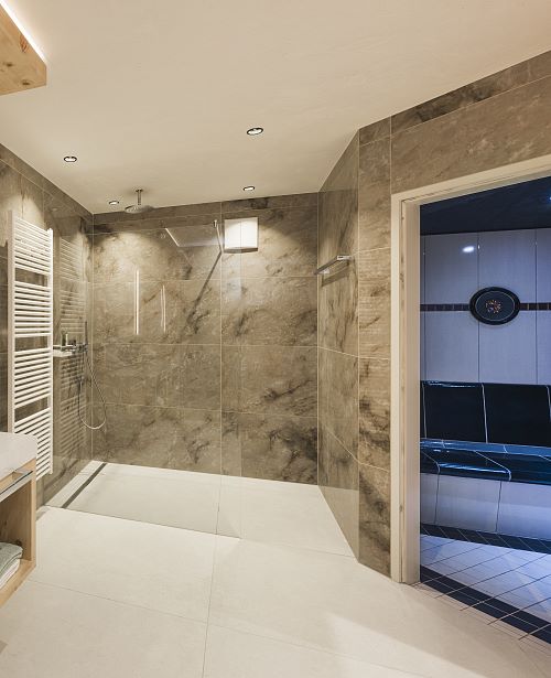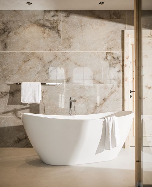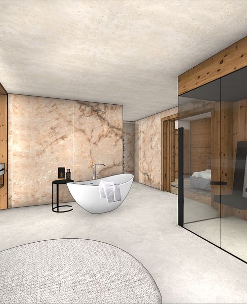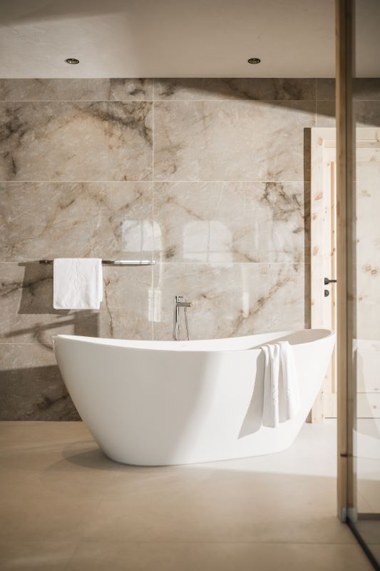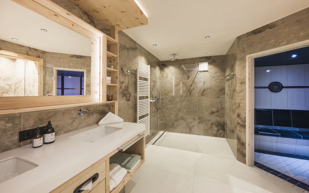 Suite in the Romantikschlössl with Swiss stone pine furnishings - Exclusive living room with large table, sofa, and tiled stove, 2 separate bedrooms, walk-in closet area, 2 spacious bathrooms with shower and bathtub, sauna, infrared cabin, relaxation lounger, separate toilet with bidet, balcony.